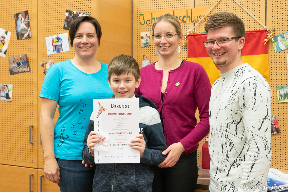 Michael Rettensteiner legte vor kurzem das Junior-Leistungsabzeichen mit ausgezeichneten Erfolg ab. Aus diesem Anlass lud ihn unsere Obfrau zu einer Orchesterprobe ein, in deren Rahmen Sabine die Urkunde und das Abzeichen überreichte. Deine künftigen Musikkollegen freuen sich auf dich, also fleißig weiter üben, damit du bald bei uns in der Kapelle mitspielen kannst.