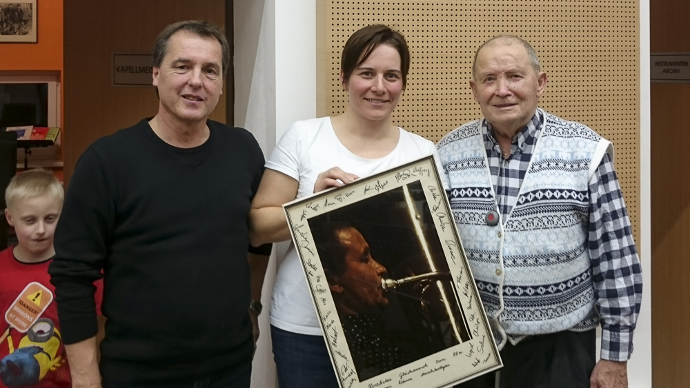 Zu Beginn des Jahres konnten wir ein langjähriges Mitglied unseres Vereins zu einem Probenbesuch einladen. Anton Huber feierte mit uns seinen 80. Geburtstag. Es gratulieren Obfrau Sabine Brandner und Kapellmeister Helmut Sonnleitner.