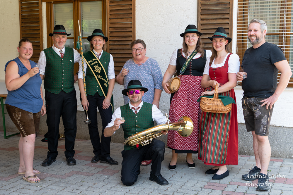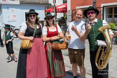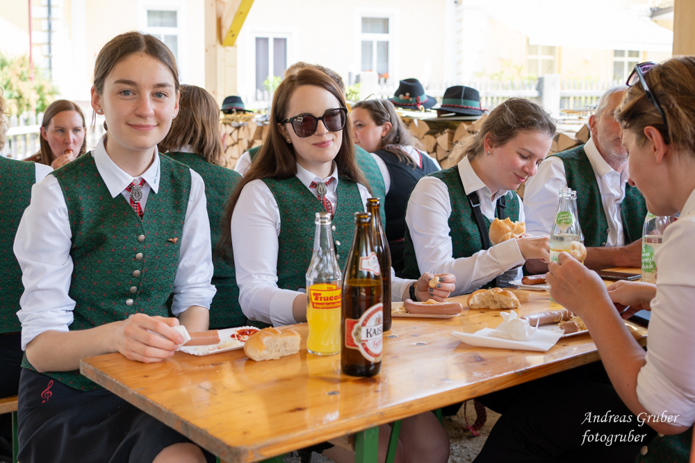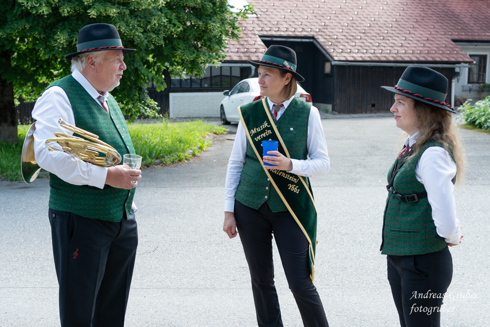 Mit flotter Marschmusik weckten wir das Dorf auf. Am frühen Morgen freuten wir uns über die Einladung zum Frühstück. Franz Irninger und sein Team verwöhnten uns im Gasthaus Dornleiten – Dorfstube mit einem kräftigen Frühstück. Gut gestärkt gings anschließend auf den kilometerlangen Weg durch die Gemeinde. Unser Ziel war die Einladung zum Mittagessen bei Franziska und Andreas Kronsteiner. Zwischendurch gab es zahlreiche Halts mit willkommenen Erfrischungen. Wir bedanken uns bei Familie Hubert Mandl und Josef Schnabler für die erste Rast. Eine kurze Pause gönnten wir uns bei Maria Anna Jagersberger und Ernst Fohringer. Bgm. Manuela Zebenholzer freute sich mit ihrer Familie über unseren morgendlichen musikalischen Besuch. Bei unserer Klarinettistin Barbara gabs eine Einladung auf Getränke. Ein großer Dank von uns Musikanten gilt Martina und Max Geyerlechner. Hier gab es neben den kühlen Erfrischungen auch eine kräftige Jause. Beim Dorfplatzwirt Dominik Fellner Gasthaus Osterberger durften wir natürlich nicht vorbeimarschieren. Eine überaus willkommene Rast in der kühlen Gaststube. Den vorletzten Stopp gabs dann bei Vizebgm. Walter Holzknecht und unserm ehemaligen Kapellmeister Christian Gruber. Der Musikverein, allen voran Obfraustv. Herbert Schenk und Stabführerin Michaela Steineck, danken für die herzliche Bewirtung und die großartige Unterstützung beim traditionellen Weckruf. Ein großes Danke auch an unsere Feuerwehr für die Begleitung bei unserem Marsch.
