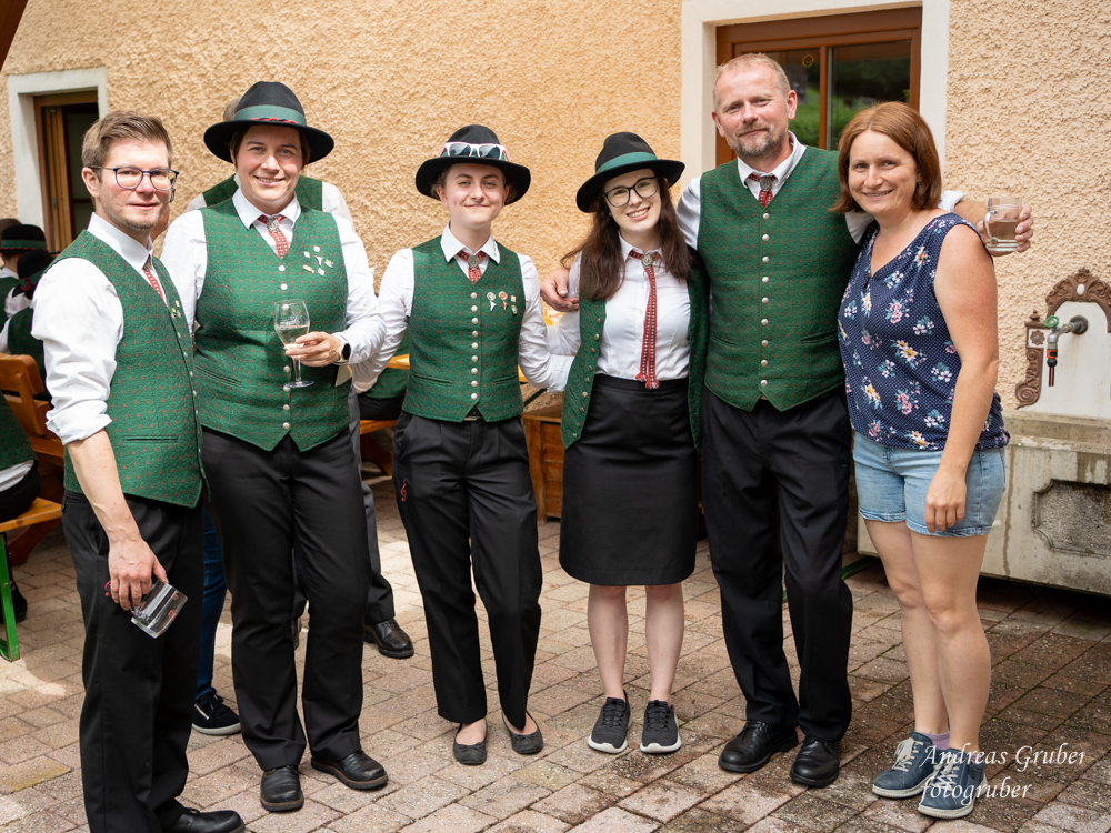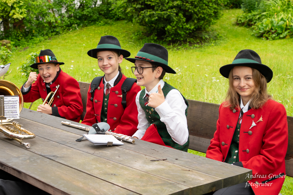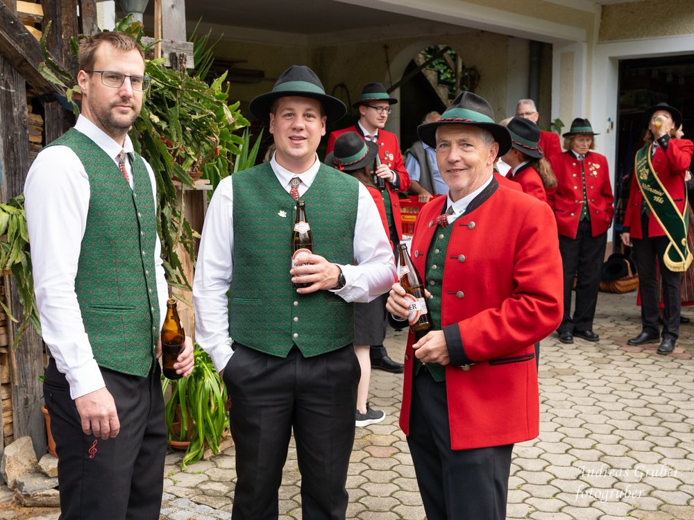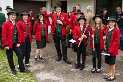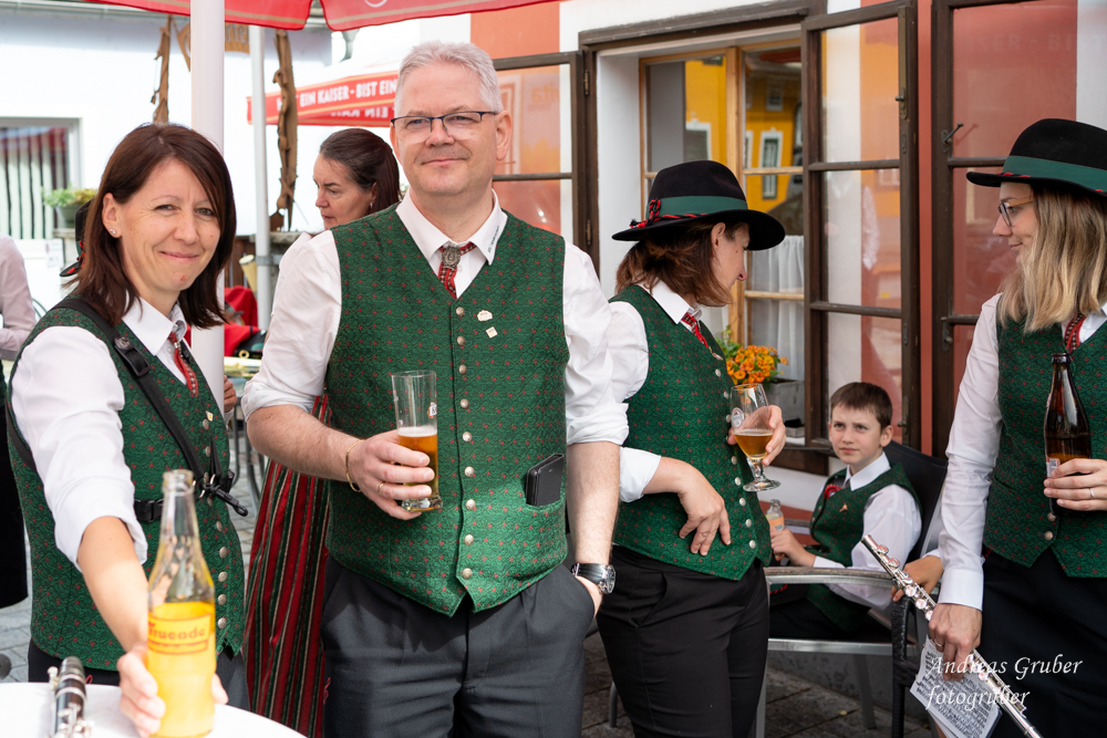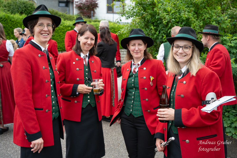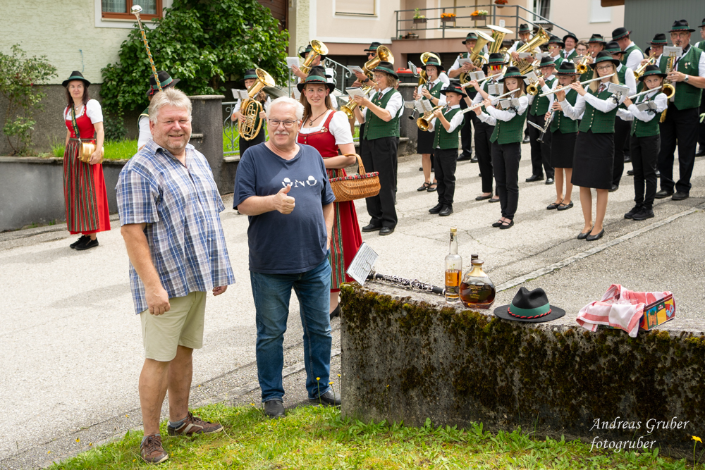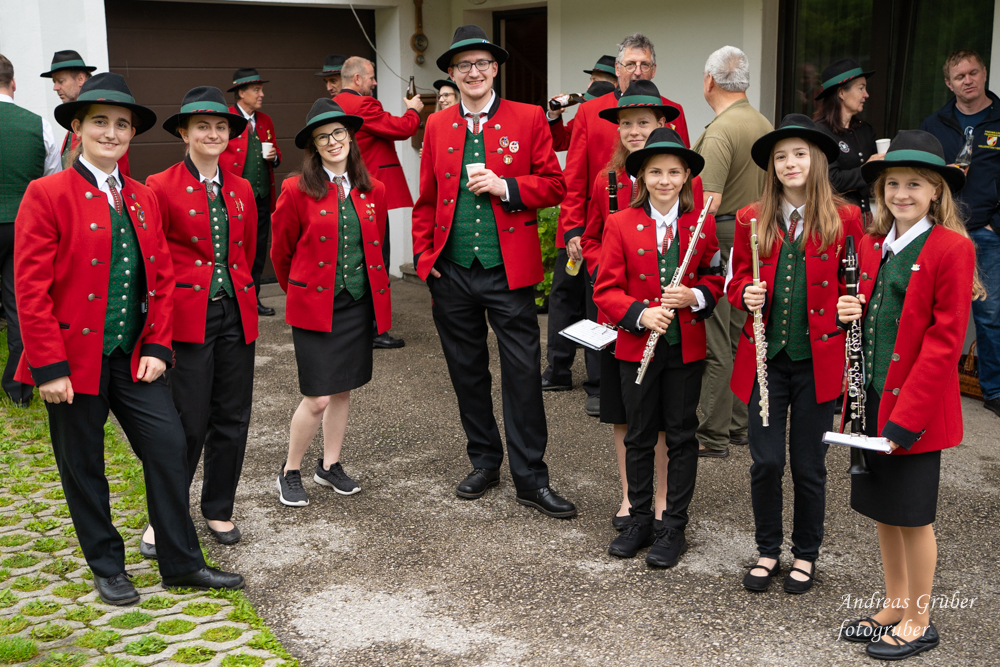 Mit flotter Marschmusik holten mit unserem traditionellen Weckruf das Dorf aus den Träumen. Rund neun Kilometer marschierten wir, angeführt von unserer Michaela am Vatertag durch die Siedlungen. Zahlreiche Einladungen zu kurzen Halts boten uns eine kleine Rast mit willkommenen Erfrischungen. Wir bedanken uns bei den Familien Hubert Mandl und Josef Schnabler für die erste Rast. Eine kurze Pause gönnte wir uns bei Maria Anna und Hermann Jagersberger. Nach einem stärkenden Frühstück im Musikheim freute sich Bgm. Manuela Zebenholzer mit ihrer Familie über den morgendlichen musikalischen Gruß bei ihr zu Hause. Beim Dorfplatzwirt Dominik Fellner Gasthaus Osterberger durfte die Kapelle natürlich nicht vorbeimarschieren und wir erledigten auch gleich unsere Stimmabgabe zur EU-Wahl. Ein großer Dank gilt den beiden Familien Franz und Helmut Paumann. Hier gab es neben den kühlen Erfrischungen auch eine kräftige Jause und Mehlspeisen. Den vorletzten Stopp machten wir bei Vizebgm. Walter Holzknecht und unserem ehemaligen Kapellmeister Christian Gruber. Nach sechs Stunden marschieren durch die Gemeinde schafften wir perfekt zur Mittagszeit unser Ziel. Mit der Einladung zum Mittagessen bei Franziska und Andreas Kronsteiner fand der Weckruf seinen gemütlichen Ausklang.