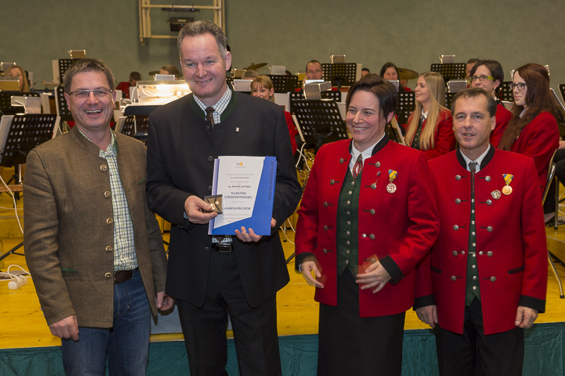 Für seinen finanziellen Einsatz zur akustischen Fertigstellung des neuen Musikheimes dankte das Orchester Michael Spitzer mit der silbernen Fördernadel des NÖ Blasmusikverbandes.