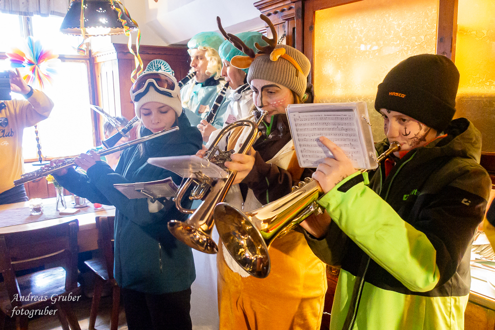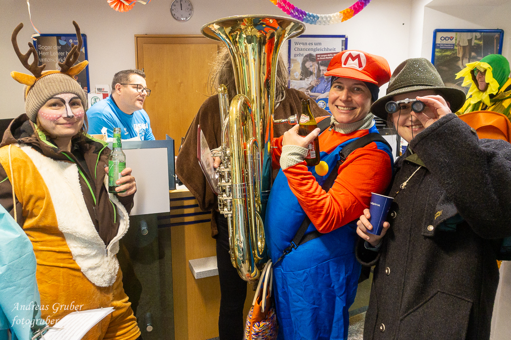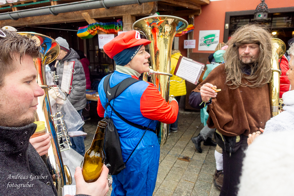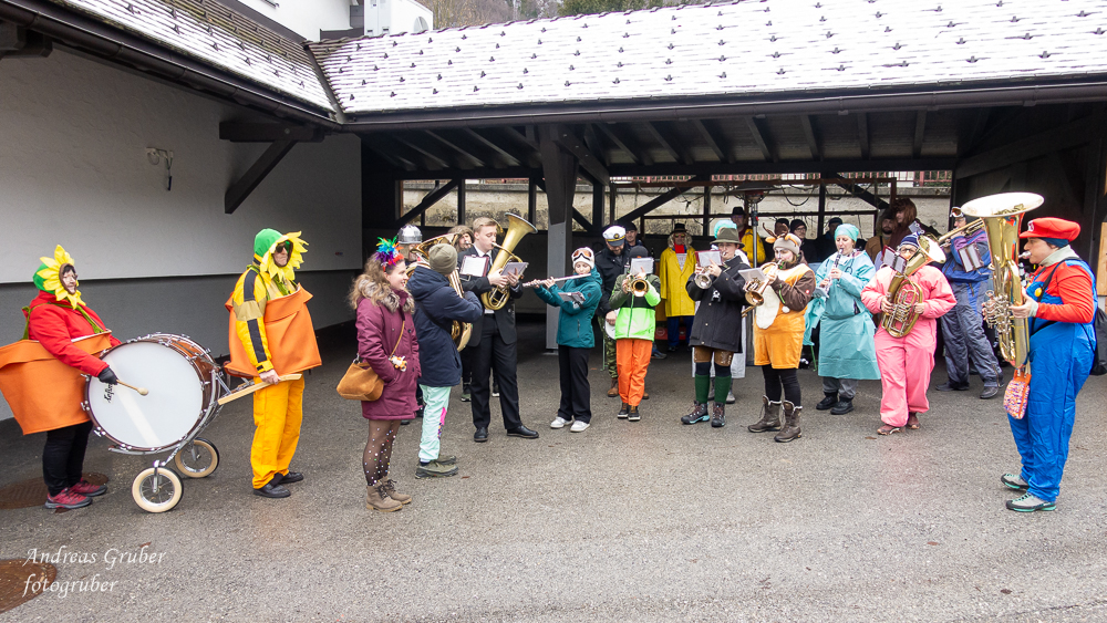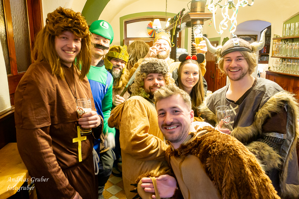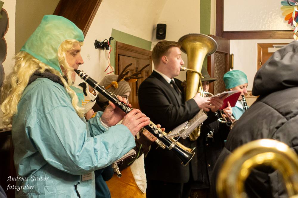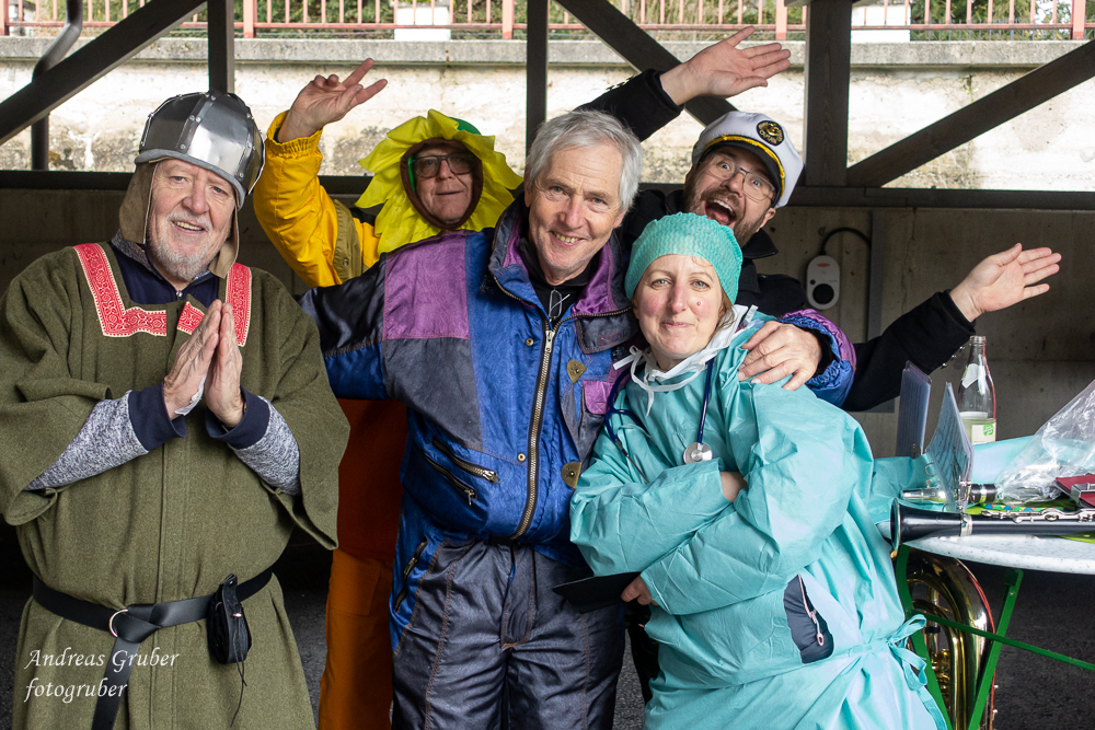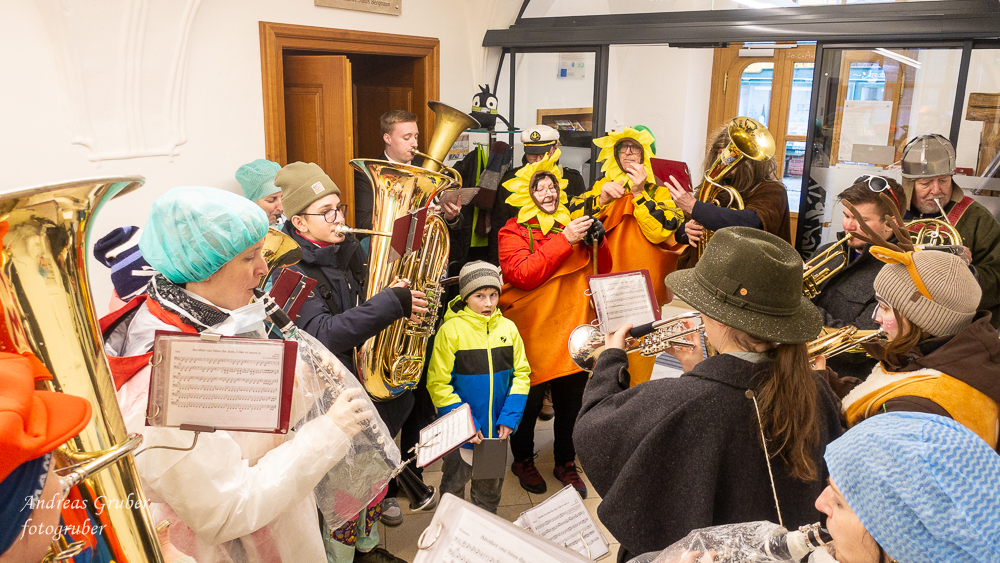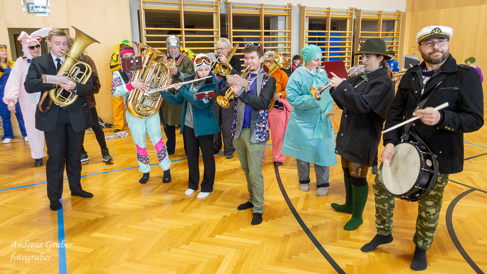 Topmotiviert zogen wir musikalischen Faschingsnarren durchs Dorf. Auf Grund der schlechten Witterung fiel der gemeinsame Einzug in den Dorfplatz mit den Kindern aus dem Kindergarten und der Schule ins Wasser. So galt unser erster Besuch unseren Jüngsten. Im Kindergarten empfing man uns mit fröhlichen Liedern und Darbietungen. Danach gabs einen kurzen Zwischenstopp in der Praxis unseres Zahnarztes, inklusiver Notfallbehandlung. Im Turnsaal der Mittelschule gings dann richtig zur Sache. Mit musikalischen Hits und coolen Tänzen steppte der Bär. Zurück im Dorf Stationen beim Gasthaus Osterberger, Versicherungsmakler Seisenbacher, Rathaus, Spar Gratzer und PlanBauHolz. Den fröhlichen Ausklang feierten wir im Gasthaus Osterberger.