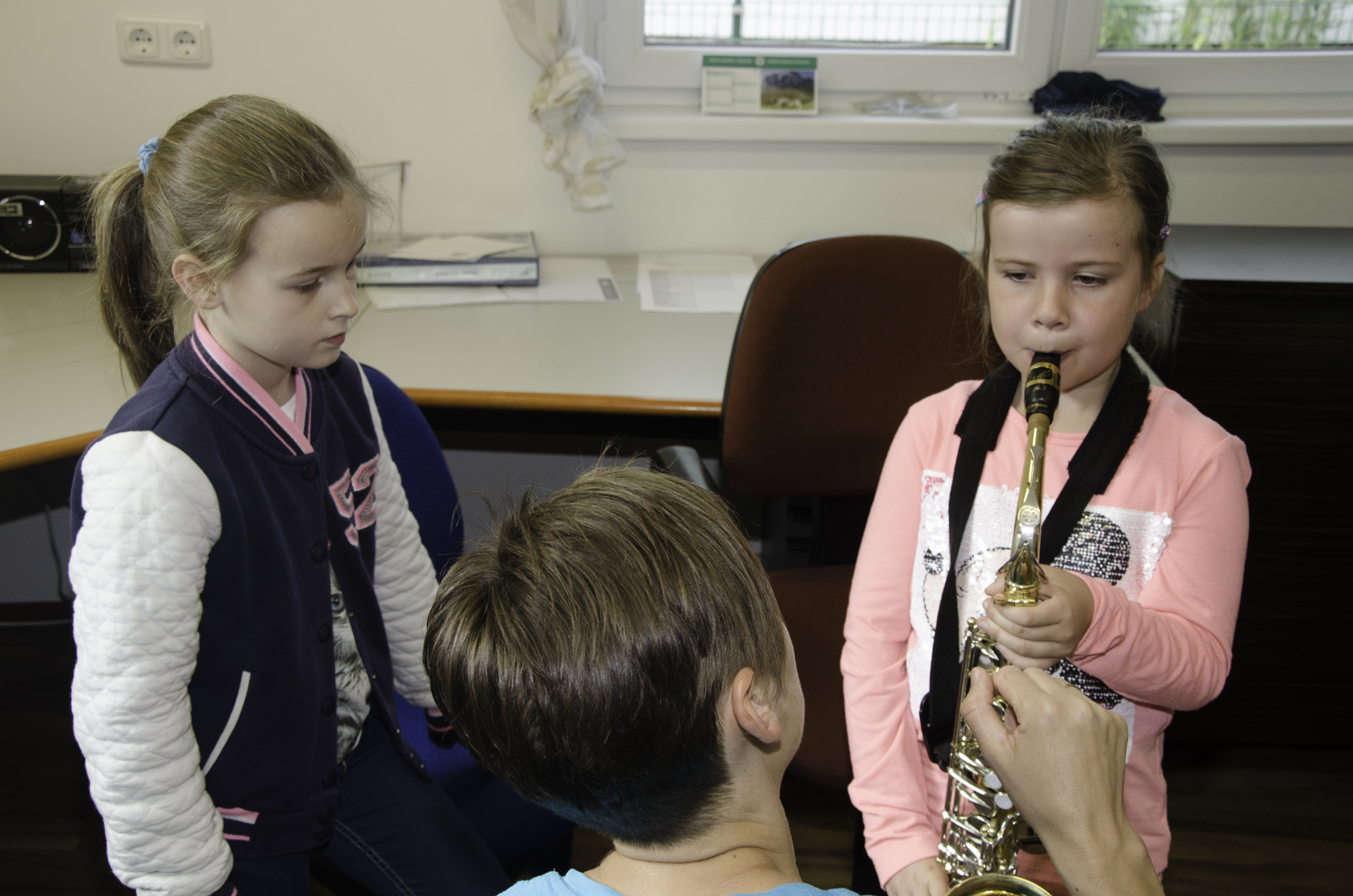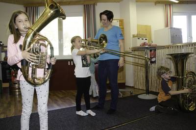 Volksschule und Kindergarten probieren Instrumente